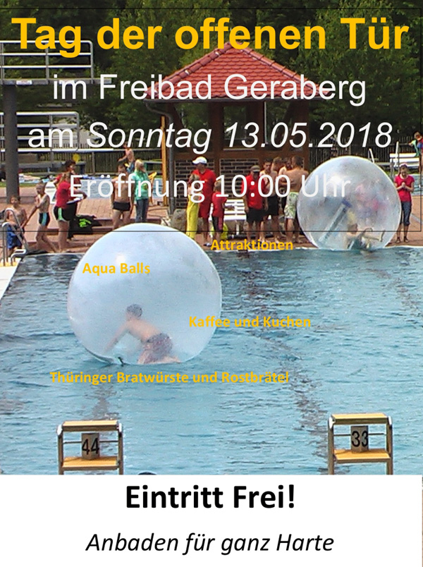 07. 05. 2018 Mit einem "Tag der offenen Tür" beginnt am kommenden Sonntag im Geraberger Freibad die Badesaison 2018. Der Eintritt ist an diesem Tag frei. [Mehr . . . ] [Poster . . . ] |